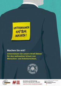 Im Rahmen einer bundesweiten Brief-Aktion forderten die Weltläden Bundeskanzlerin Merkel auf, Unternehmen zu verpflichten, Menschenrechte weltweit verbindlich zu schützen. Alle Bürger waren eingeladen, im Weltladen in der Steinstr. 5 oder am 14. Mai auf dem Marktplatz einen Brief zu unterschreiben. Die 85 Briefe wurden vom Weltladen an das Kanzleramt geschickt, damit sie kurz vor der entscheidenden Sitzung des Bundeskabinettes ankamen. Denn bis Mitte Juni entscheidet die Bundesregierung über den Nationalen Aktionsplan für Wirtschaft und Menschenrechte und ob dieser eine verbindliche Unternehmensverantwortung festschreibt.