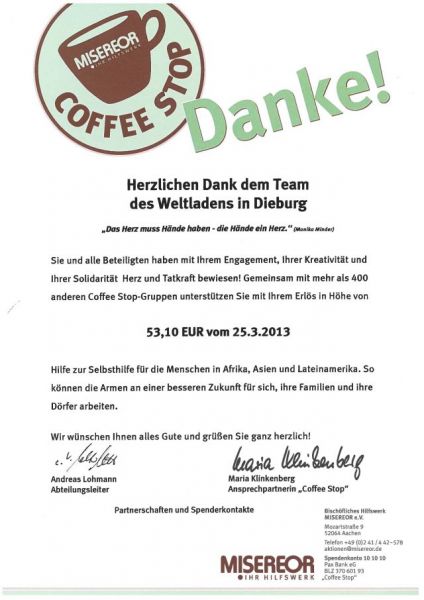 Zur „Coffee-Stop-Aktion“ rief der Eine Welt Verein Dieburg e.V. gemeinsam mit MISEREOR auf. Die Idee ist ganz einfach: Es wird fair gehandelter Kaffee zubereitet und gegen eine freiwillige Spende an Passanten ausgeschenkt. Die Aktion findet jährlich in vielen deutschen Städten an verschiedenen Orten zu Hause, in Fußgängerzonen, bei der Arbeit, in Schulen oder in Vereinen statt.Mit dieser Aktion unterstützen die Kaffeetrinkenden mit ihrer freiwilligen Spende Menschen in Afrika, Asien und Lateinamerika und bekommen dafür eine heiße Kaffeespezialität. So fördern sie MISEREOR-Projekte und die Hilfe zur Selbsthilfe in den Ländern des Südens.