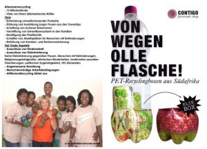 ist der einfache aber erfolgreiche Wahlspruch von All Women Recycling, einer kleinen Frauenkooperative in Südafrika. Das Erfolgsprinzip ist einfach: All Women Recycling erschaffen gefragte und schicke recycelte Produkte, die zum Martinsmarkt 2013 vom Weltladen Dieburg angeboten werden. Es sind kleine, trendige, äußerst praktische Boxen, hergestellt aus recycleten Plastik-Trinkflaschen. Sie können als Tischdekoration, Geschenkverpackung oder Aufbewahrungsboxen für vielerlei Utensilien in Wohnung, Küche oder Bad verwendet werden. Der Fantasie ist hier keine Grenze gesetzt und es gibt sie in vielfältigen Mustern und Farben. Sie siund spritzwasserfest, stabil und festschließend und somit ideal für die Aufbewahrung von Schmuck oder sonstigen Kleinteilen. Geöffnet stellen sie eine dekorative Hülle für Teelichter dar.