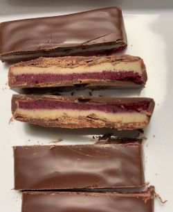 Dunkle Milchschokolade° gefüllt mit Waldbeercreme°(30%) und Vanilleganache°(28%)