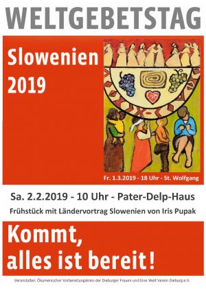 "Kommt, alles ist bereit!" lautet der Titel des diesjährigen Weltgebetstages. Passend hierzu bereiten die Ökumenische Vorbereitungskreis der Dieburger Frauen im Pater-Delp-Haus in Dieburg am 2. Februar ein reichhaltiges Frühstück. Kommen Sie und genießen Sie und hören dabei etwas zu dem kleinen Land zwischen Alpen und Adria mit vielen unterschiedlichen Naturregionen. Lernen Sie die Schönheit Sloweniens kennen. Erfahren Sie mehr über das Leben der Frauen und die sozialen Bedingungen in dem ehemals kommunistischen Land. Slowenien blickt auf eine junge Demokratie zurück. Nehmen Sie Einblick in das wirtschaftliche, politische und kulturelle Zentrum. Hören Sie vom unterscheidlichen Leben in der Stadt und auf dem Land.
