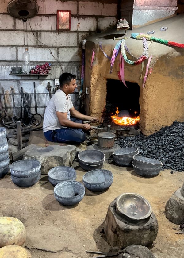 Die “klassischen” Klangschalen werden aus einem Metallguss gehämmert beziehungsweise getrieben. Sie erhalten dadurch eine viel unregelmäßigere Form und klingen auch in sich dynamischer und körperlich sinnlicher. Ausgangsform ist hier eine kleine, gewölbte Metallscheibe, die zuvor gegossen wurde. Diese Scheibe wird nun mit einer Zange ins offene Feuer gehalten, bis sie rotglühend heiß ist. Dann holt der Schmied sie aus dem Feuer und hält sie auf einem Amboss, der eine runde Kuhle aufweist, mit der Zange fest. Er dreht den Rohling, während andere Männer im Takt mit Hämmern auf das Metall einschlagen. Wenn das Metall erkaltet ist, hält der Schmied den Rohling erneut ins Feuer. Dieser Vorgang wird solange wiederholt, bis die Schale in Form gebracht wurde. Je nach Größe der Schale sind 3 bis 5 Männer an der Arbeit beteiligt. Auch die getriebenen Schalen werden anschließend nachbearbeitet und poliert. Werkzeugspuren, Unebenheiten und kleine Dellen sind hier jedoch immer noch spürbar.
